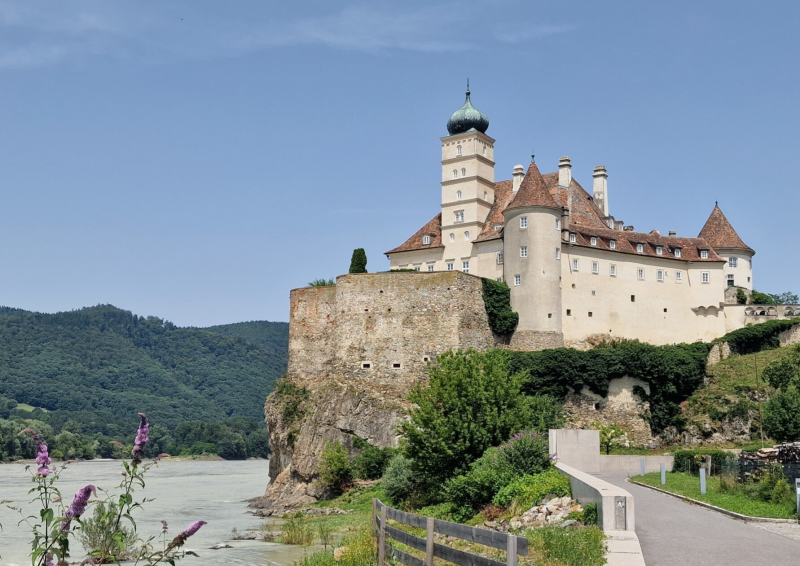 "The footpath along the southern bank was leading me into the heart of the Wachau, a region of the Danube as famous as those stretches of the Rhine I had traveledat Christmas or the Loire in Touraine. Melk was the threshold of this unspeakably beautiful valley".[...] "I sat under a birch tree to sketch Schloss Schönbühel. Gleaming as though it were carved ivory, it sprang out of a pivot of rock which the river almost surrounded and ended in a single and immensely tall white tower crowned with a red onion cupola".